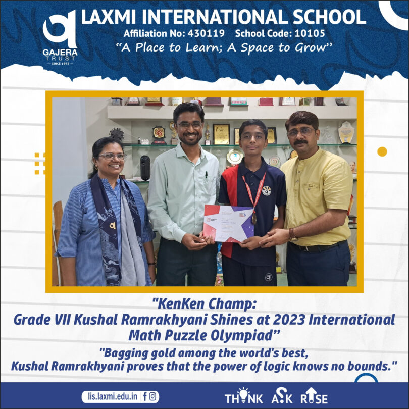 કુશલ રામરખ્યાની પોતાનો ઉત્સાહ,ધગશ,અથાગ પરિશ્રમ થકી અને શાળાના ગણિત વિભાગના શિક્ષકોના યોગ્ય માર્ગદર્શન હેઠળ *’KenKen કોયડા ઉકેલ’* સ્પર્ધામાં ભારત દેશને આપવામાં આવેલ ૧૪ ચંદ્રકોમાંથી એક સુવર્ણચંદ્રક લાવી શાળા તથા દેશનું નામ રોશન કરવામાં આવતા ખુશીની લાગણી શાળા પરિસરમાં પ્રસરી હતી.
