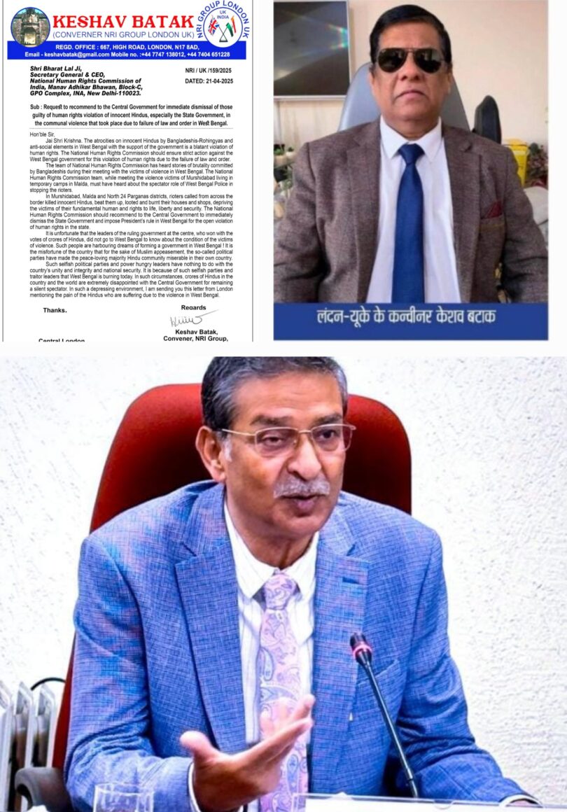 एनआरआई केशव बटाक ने पश्चिम बंगाल की साम्प्रदायिक हिंसा पर पीएम, एचएम को कड़ा पत्र लिखने के बाद आज राष्ट्रीय मानवाधिकार आयोग ( NHRC) के महासचिव व सीईओ भरत लाल को पत्र लिख कर पश्चिम बंगाल हिसा के पीड़ितों के दोषियों पर सख्त कार्रवाई सुनिश्चित करने की मांग की है। एनआरआई केशव बटाक ने राष्ट्रीय मानवाधिकार आयोग के महासचिव को भेजे पत्र में लिखा कि पश्चिम बंगाल में सत्ता की शह पर बांग्लादेशियों-रोहिंग्याओं और आसामाजिक तत्वों द्वारा बेकसूर हिन्दुओं पर अत्याचार मानवाधिकारों का खुला उल्लंघन है। कानून-व्यवस्था की विफलता के कारण हुए मानवाधिकारों के इस उल्लंघन पर राष्ट्रीय मानवाधिकार आयोग को पश्चिम बंगाल सरकार पर कठोर कार्रवाई सुनिश्चित करानी चाहिए। राष्ट्रीय मानवाधिकार आयोग के दल ने पश्चिम बंगाल के हिंसा पीड़ितों से मुलाकात में बांग्लादेशियों की बर्बरता की बातें सुनी हैं। राष्ट्रीय मानवाधिकार आयोग के दल ने मालदा के अस्थाई शिविरों में रह रहे मुर्शिदाबाद के हिंसा पीड़ितों से मुलाकात में दंगाइयों को रोकने में पश्चिम बंगाल पुलिस की तमाशबीन भूमिका के बारे में भी सुना ही होगा। मुर्शिदाबाद, मालदा, नॉर्थ 24 परगना जिलों में सीमा पार से बुलाये गये दंगाइयों ने निर्दोष हिन्दुओं का कत्ल कर, मार-पीट कर, घरों-दुकानों को लूट और जला कर पीड़ितों को जीवन, स्वतंत्रता और सुरक्षा संबंधी मानव व मौलिक अधिकारों से वंचित किया है। राष्ट्रीय मानवाधिकार आयोग को पश्चिम बंगाल में मानवाधिकारों के खुले उल्लंघन के हुए नंगे नाच पर राज्य सरकार को तुरंत बर्खास्त कर राष्ट्रपति शासन लगाने की सिफारिश केन्द्र सरकार को करनी चाहिए। करोड़ों हिन्दुओं के वोटों से जीत कर केन्द्र में सत्तारूढ़ सरकार के कर्णधारों का पश्चिम बंगाल के हिंसा पीड़ितों का हाल-समाचार जानने नहीं जाना भी दुर्भाग्यपूर्ण है। ऐसे लोग पश्चिम बंगाल में सरकार बनाने का सपना पाले बैठे हुए हैं ! देश का दुर्भाग्य है कि मुस्लिम तुष्टिकरण के लिए कथित राजनैतिक दलों ने शांतिप्रिय बहुसंख्यक हिन्दू समुदाय को अपने ही देश में बेचारा बना दिया है। ऐसे कथित स्वार्थी राजनैतिक दलों और सत्ता के भूखे तथाकथित नेताओं को देश की एकता-अखंडता और राष्ट्रीय सुरक्षा से कोई सरोकार नहीं है। ऐसी कथित स्वार्थी पार्टियों और तथाकथित गद्दार नेताओं के चलते ही आज पश्चिम बंगाल जल रहा है। ऐसे हालातों में केन्द्र सरकार के मूक दर्शक बने रहने से देश और दुनिया के करोड़ों हिन्दुओं में भारी निराशा है। ऐसी निराशाजनक माहौल में मैं लंदन से पश्चिम बंगाल के हिंसा पीड़ितों के दु:ख में दु:खी हिन्दुओं की वेदना को इस पत्र में उल्लेखित कर आपको भेज रहा हूँ।