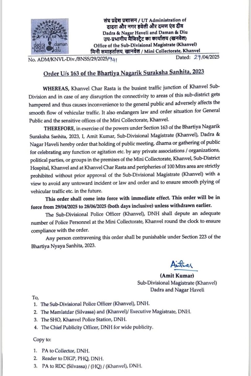 खानवेल उप-मंडल के सबसे व्यस्त चौराहे खानवेल चार रास्ता पर यातायात व्यवस्था और आमजन की सुविधा को ध्यान में रखते हुए उप-मंडल दंडाधिकारी (SDM) अमित कुमार ने भारतीय नागरिक सुरक्षा संहिता, 2023 की धारा 163 के तहत सख्त आदेश जारी किया है।आदेश के अनुसार, 29 अप्रैल 2025 से 28 जून 2025 तक खानवेल मिनी कलेक्ट्रेट, उप-जिला अस्पताल, खानवेल चार रास्ता तथा इनके 100 मीटर के दायरे में किसी भी प्रकार की सार्वजनिक बैठक, धरना, समारोह अथवा विरोध प्रदर्शन बिना पूर्व अनुमति के आयोजित करना प्रतिबंधित रहेगा।प्रशासन का कहना है कि इस क्षेत्र में कोई भी अवरोध जनसामान्य को असुविधा पहुंचा सकता है और कानून व्यवस्था के लिए खतरा बन सकता है।आदेश में यह भी निर्देश दिया गया है कि खानवेल के उप-मंडल पुलिस अधिकारी इस आदेश के अनुपालन हेतु पर्याप्त संख्या में पुलिस बल तैनात करें।इस आदेश का उल्लंघन करने पर संबंधित व्यक्ति के विरुद्ध भारतीय न्याय संहिता, 2023 की धारा 223 के अंतर्गत दंडात्मक कार्यवाही की जाएगी।