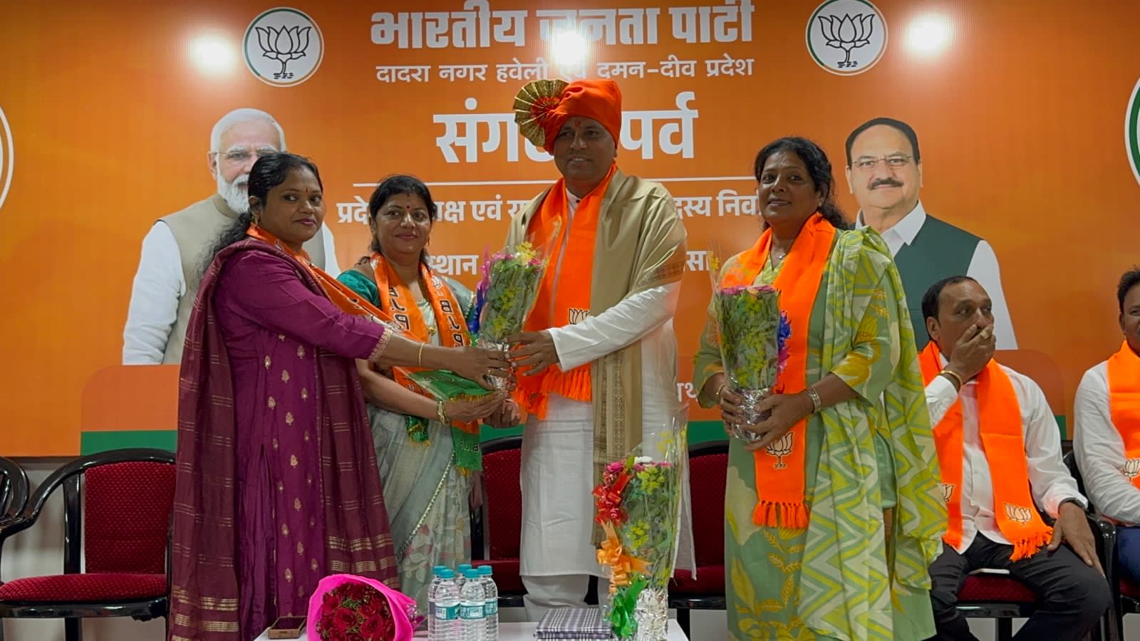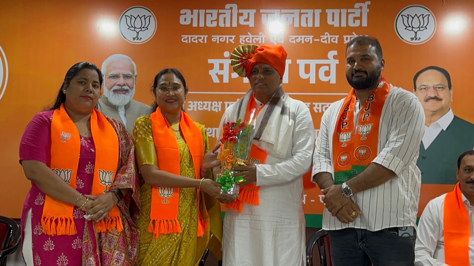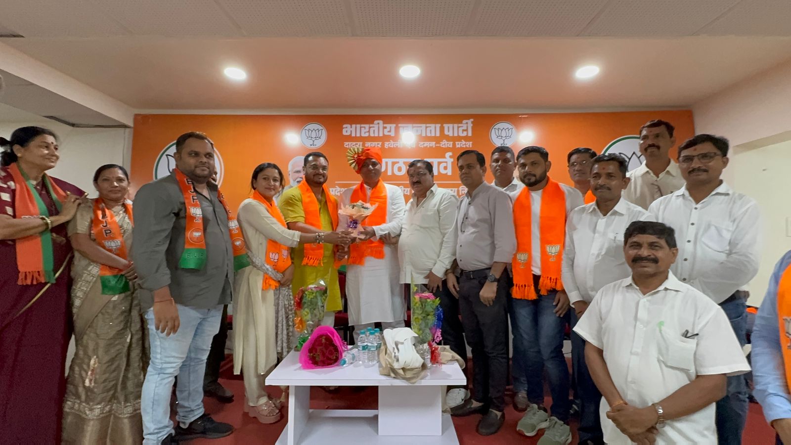 भारतीय जनता पार्टी दादरा नगर हवेली एवं दमन दीव प्रदेश के नवनियुक्त प्रदेश अध्यक्ष श्री महेश भाई अगरिया आज अध्यक्ष पद ग्रहण करने के पश्चात आधिकारिक रूप से भाजपा कार्यालय अटल भवन सिलवासा के अपने प्रथम दौरे पर पहुँचे। इस अवसर पर भाजपा के कार्यकर्ताओ द्वारा उनका भव्य स्वागत एवं सम्मान किया गया।इस अवसर पर भाजपा के प्रदेश के महामंत्री श्री सुनील पाटिल, श्री जीतु भाई माढा, सिलवासा शहर जिला अध्यक्ष शांतु भाई पुजारी, सिलवासा ग्रामीण जिला अध्यक्ष दीपक भाई प्रधान, खानवेल जिला भाजपा के अध्यक्ष यशवंत भाई खुटिया, दादरा नगर हवेली जिला पंचायत के अध्यक्ष दामजी भाई कुराड़ा, सिलवासा नगरपालिका की अध्यक्षा श्रीमती रजनी बेन शेट्टी, भाजपा के प्रदेश उपाध्यक्ष धर्मेश सिंह चोहान, श्रीमती भारती बेन हलपति, श्री अनिल दीक्षित, श्रीमती निशा बेन भावर, श्री सुनील महाजन उपस्थित रहे। आज दादरा नगर हवेली के विविध समाजों के प्रतिनिधियों द्वारा नवनियुक्त अध्यक्ष श्री को बधाई एवं शुभकामनाएँ दी गई। अल्पसंख्यक मोर्चा के महामंत्री श्री मुस्ताक भाई तवा और उपाध्यक्ष श्री वाहिद भाई कालिया द्वारा पुष्पगुच्छ देकर सम्मानित किया। महाराष्ट्र समाज एवं अन्य सामाजिक संस्थाओं द्वारा उन्हें सम्मानित किया गया।उतर भारतीय प्रकोष्ठ की और से श्री द्वारिकानाथ पांडे जी के नेतृत्व में स्वागत किया गया।